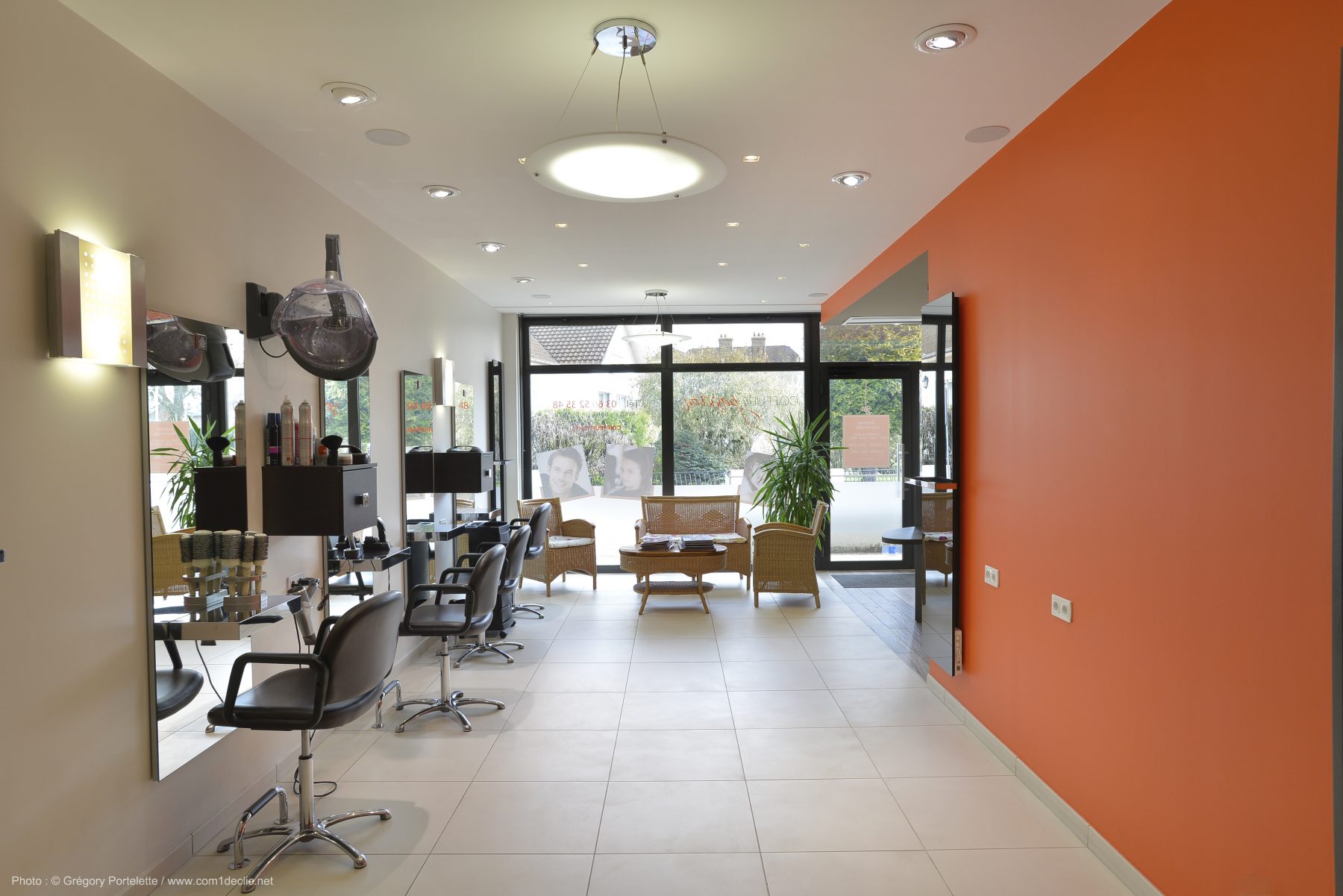 Les parois extérieurs et plafonds ont bénéficié d’une isolation renforcée. Un rideau d’air chaud limite les déperditions lorsque les clients entrent et sortent du salon.