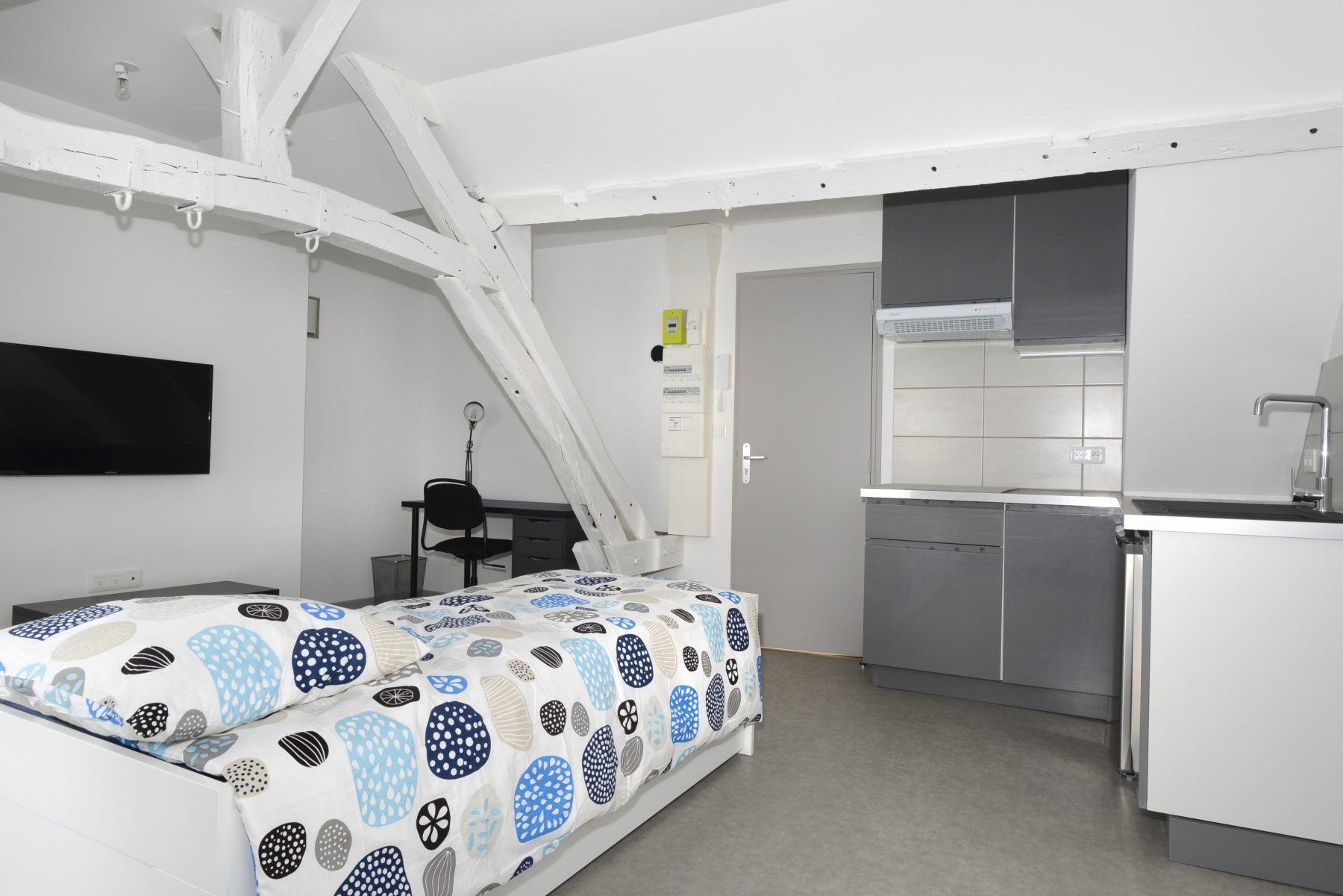 Dans ce projet, s’agissant de créer des studios, NEOPACIO a d’une part proposé l’optimisation des surfaces habitables en agençant les studios comprenant chacun un coin cuisine, un couchage, une salle de douche et des WC.